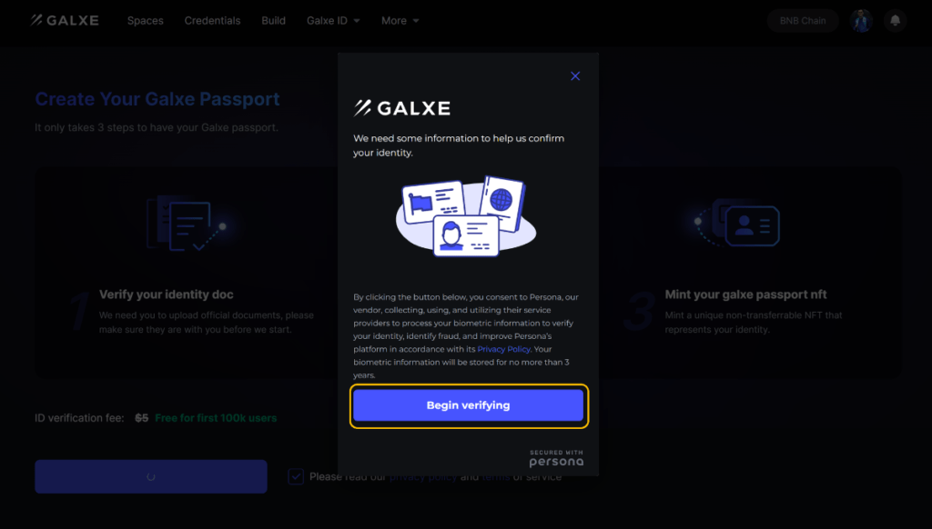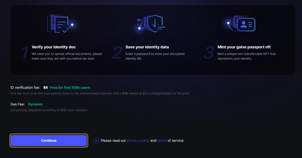 Use one of the following three identifications to prove your identity: a passport, a driver’s license, or a citizen identification. Users can mint Galxe Passport Soulbound after following the above steps.