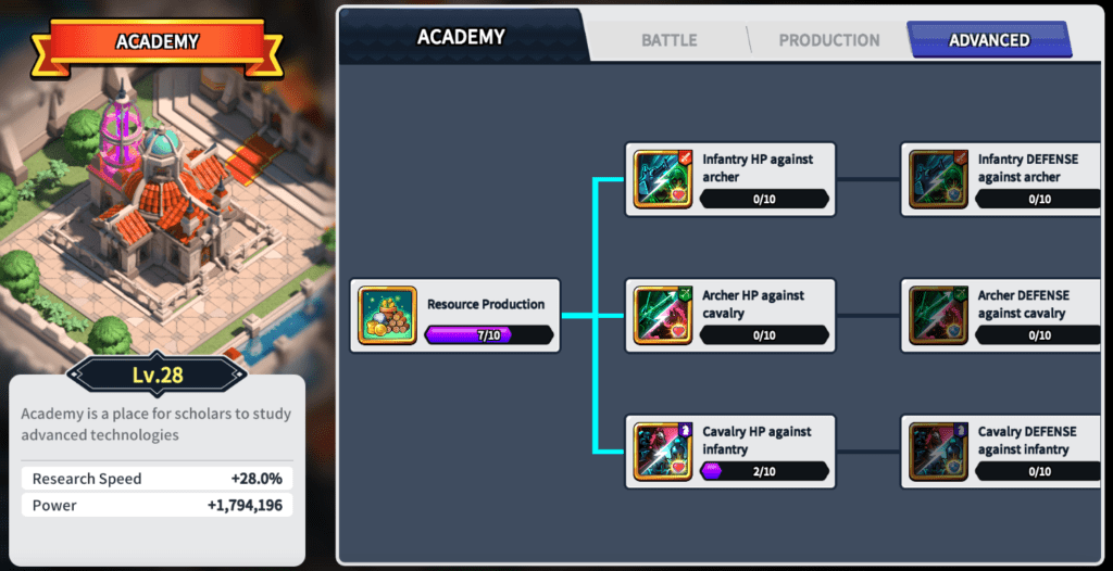 Học viện: Bạn có thể đầu tư nguồn lực và thời gian để phát triển công nghệ mới tại tòa nhà học viện nằm trong lâu đài của bạn. Có ba loại chính: Chiến đấu, Sản xuất và Công nghệ tiên tiến.