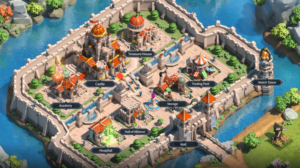 Vương quốc của bạn bao gồm lâu đài bên trong, nơi có một số tòa nhà có thể được nâng cấp để mở khóa các tòa nhà cấp cao hơn hoặc nâng cấp công nghệ của bạn. Bạn có thể xây dựng nhiều tòa nhà khác nhau bên trong vương quốc của mình. Xây dựng các tòa nhà đòi hỏi thời gian và nguồn lực. Các cấp độ cao hơn yêu cầu đầu tư nhiều tài nguyên/thời gian hơn nhưng năng suất cao hơn.