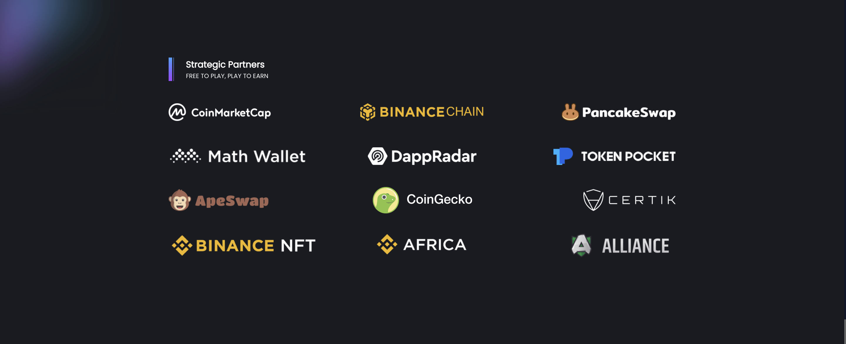 Nhiều đối tác nổi tiếng như: Binance chain, Binance Labs, Binance NFT, PancakeSwap, ApeSwap, Coinmarketcap,coingecko,….