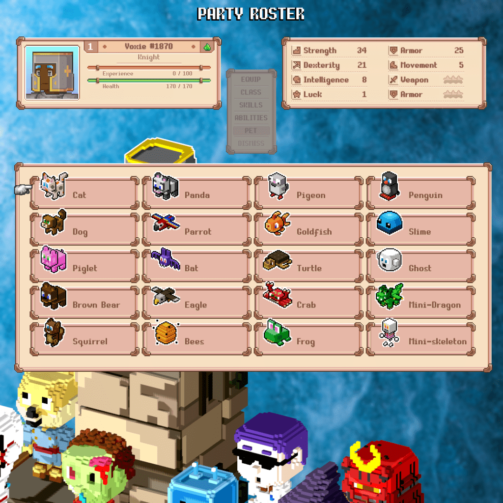 - Một số Voxies trong sê-ri NFT đã có sẵn thú cưng đồng hành, vì vậy sẽ không cần tìm thú cưng đồng hành trong trò chơi để hỗ trợ một số yếu tố chơi trò chơi.