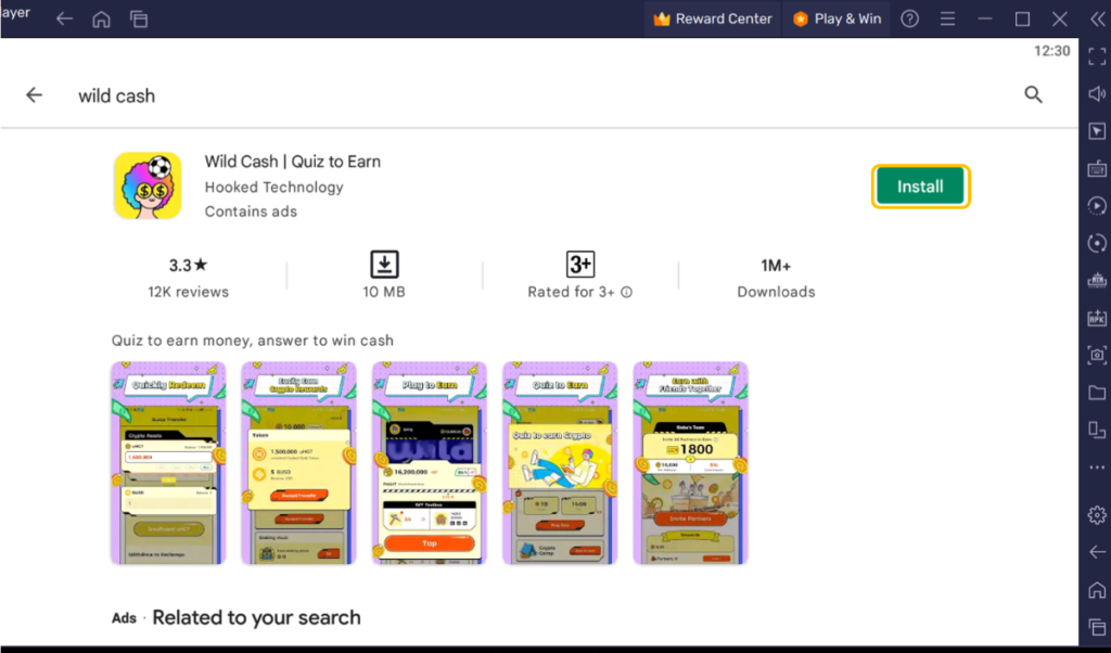- Tại Google Play, gõ “wild cash” trên thanh tìm kiếm và nhấp vào “Install” để cài đặt ứng dụng.