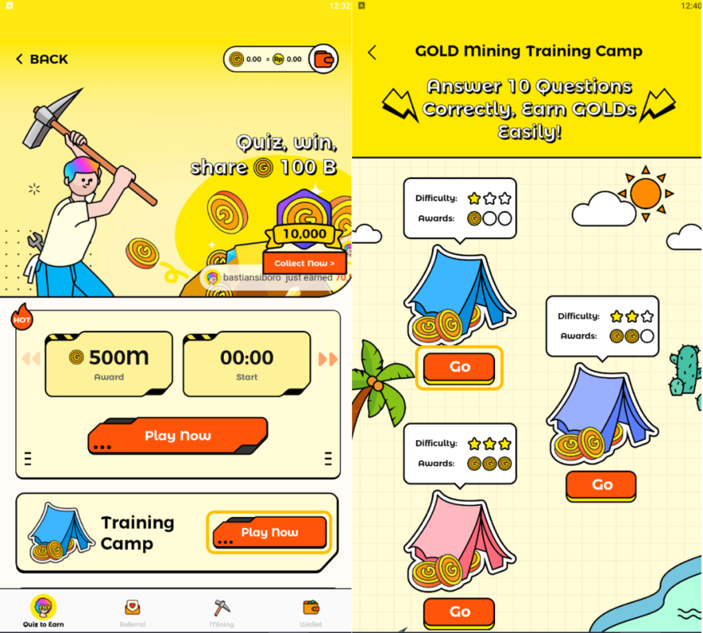 - Tính năng: Quiz to Earn, Mining game, Referral, Staking, Swap và Transfer