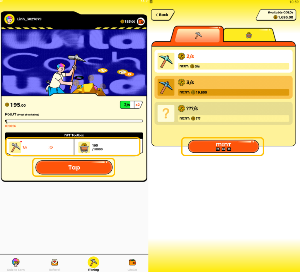 Mining là chế độ khai thác HGT thông qua mint NFT toolbox là rìu hoặc xe đẩy. Để tăng tốc độ đào, người dùng phải nâng cấp các NFT này bằng token HGT. Các NFT toolbox này giúp việc đào coin diễn ra tự động ngay cả khi người dùng bận và thoát ra khỏi ứng dụng. Ngoài việc để các NFT auto mining, người dùng có thể nhấp vào mục “Tap” để đào thủ công, mỗi lần nhấp chuột được tính là một lần đào. Số lượng coin khi đào thủ công sẽ tương ứng với số lượng coin mà các NFT khai thác được.